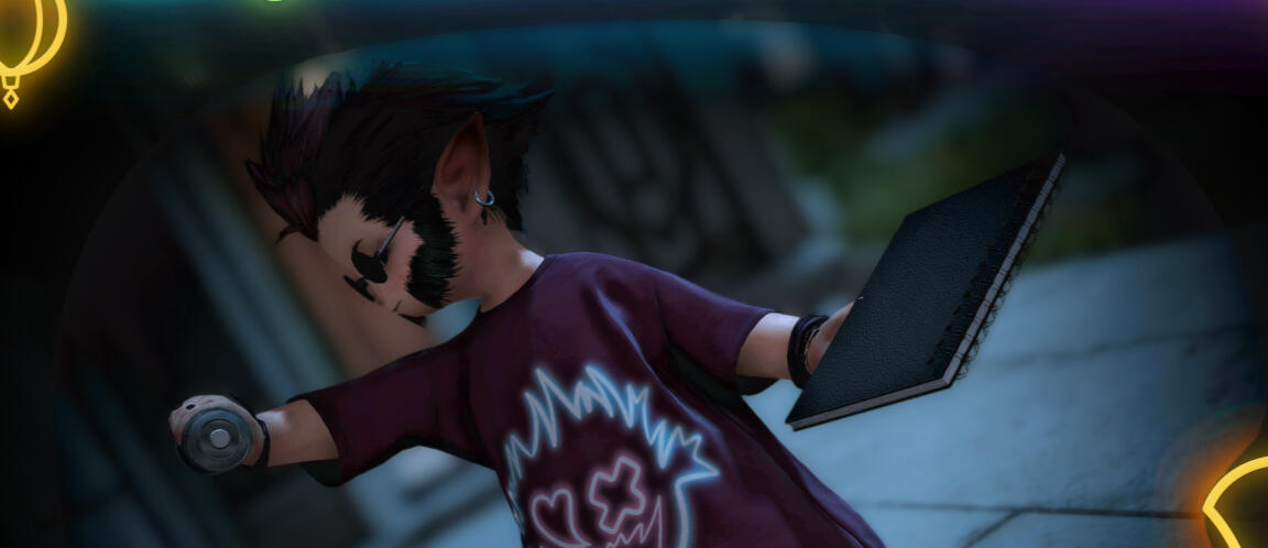 a milalla born and raised on the mean streets of treno, solos murdrum was a bard and beat poet busking for a living, barely making ends meet. that is, until that fateful day when the warrior of light came a knockin', showing him a world beyond his own, and without much planning or thought solos found himself a stowaway on an airship bound for living memory and beyond! once free of the timey-w-imey-bubbly-wubbly solos went walkabout. finding a ship to old sharlayan, he managed to navigate his lack of appropriate paperwork with the customs and excise clerk using some good old fashioned charm, and when that didn't work, some good old fashioned cutting-and-running. as one would surmise, a gaggle of eggheads in white coats were a poor match for solos, who'd spent his life playing lethal hide-and-seek with levin beasts who could soft-boil his eyeballs.Once inside sharlayan it was simple enough to pose as a first year student, shocked at the lack of questions asked by a bunch of folks supposedly bent on knowing everything about everything. an even smaller shock was just how lacking sharlayan's art program was. as in there wasn't one, save for an electoral on the avant-garde professor relm and "pictomancy". instantly solos felt a connection to this bizarre magical art form. improvising in the way only a street musician knew how, solos swapped the brush and palette for his handy-dandy electrope spraypaint canister and his trusty sketch folio, and dipped before another abysmal serving of archonloaf could be foisted on him.