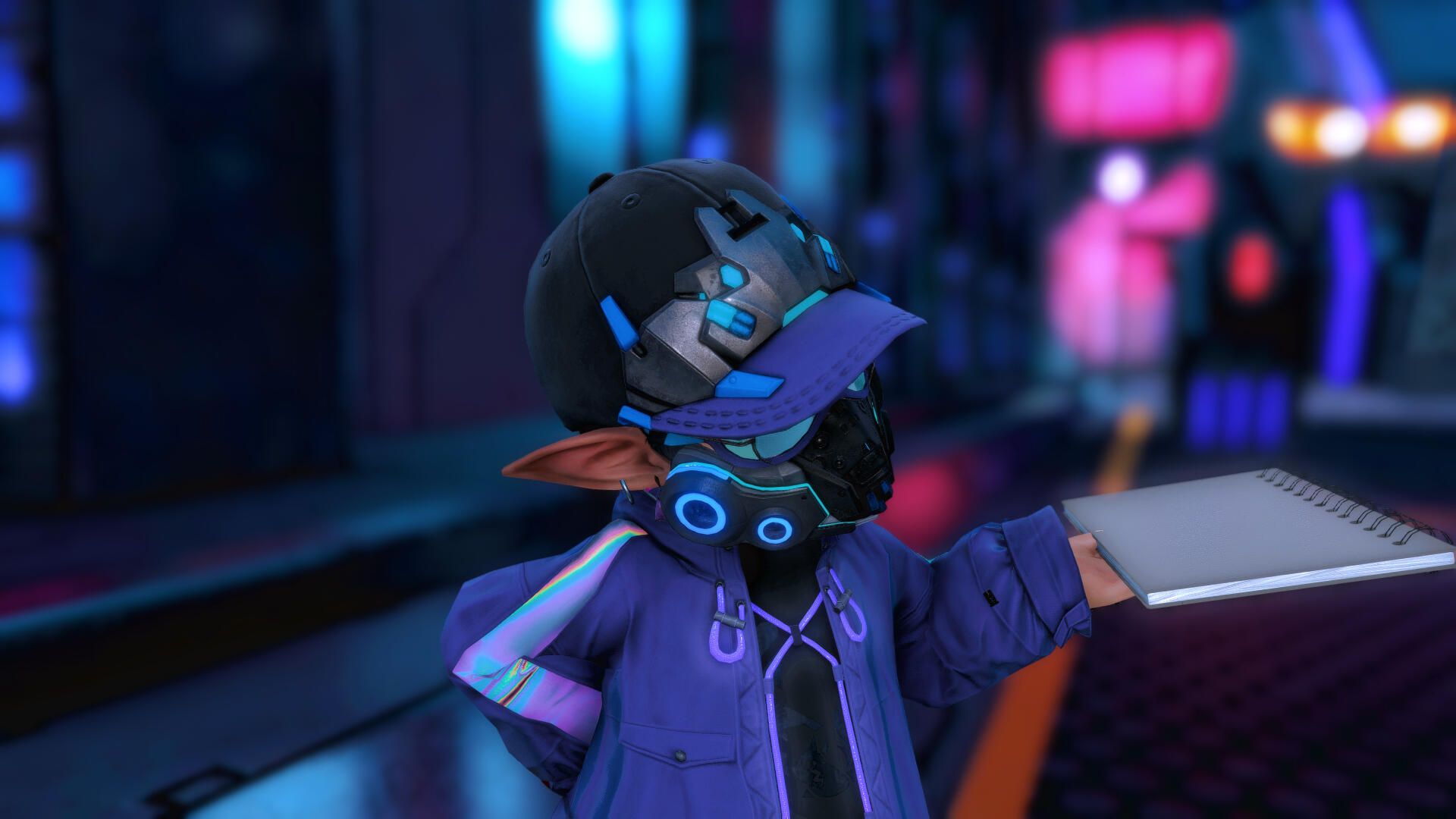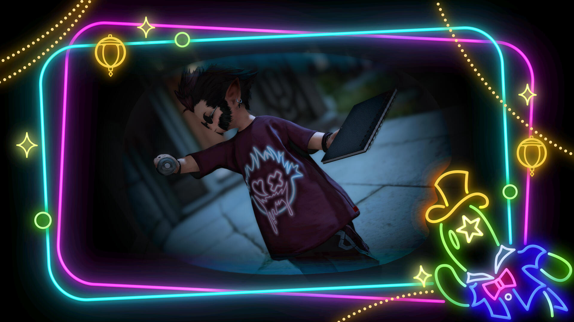 a milalla born and raised on the mean streets of treno, solos murdrum was a bard and beat poet busking for a living, barely making ends meet. that is, until that fateful day when the warrior of light came a knockin', showing him a world beyond his own, and without much planning or thought solos found himself a stowaway on an airship bound for living memory and beyond! once free of the timey-w-imey-bubbly-wubbly solos went walkabout. finding a ship to old sharlayan, he managed to navigate his lack of appropriate paperwork with the customs and excise clerk using some good old fashioned charm, and when that didn't work, some good old fashioned cutting-and-running. as one would surmise, a gaggle of eggheads in white coats were a poor match for solos, who'd spent his life playing lethal hide-and-seek with levin beasts who could soft-boil his eyeballs.Once inside sharlayan it was simple enough to pose as a first year student, shocked at the lack of questions asked by a bunch of folks supposedly bent on knowing everything about everything. an even smaller shock was just how lacking sharlayan's art program was. as in there wasn't one, save for an electoral on the avant-garde professor relm and "pictomancy". instantly solos felt a connection to this bizarre magical art form. improvising in the way only a street musician knew how, solos swapped the brush and palette for his handy-dandy electrope spraypaint canister and his trusty sketch folio, and dipped before another abysmal serving of archonloaf could be foisted on him.